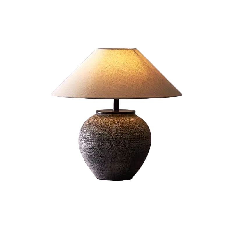 This table lamp features a wide tapered shade that directs light downward. The base is made from ceramic with a textured, stone-like surface. The ceramic base narrows at the top and widens toward the bottom.