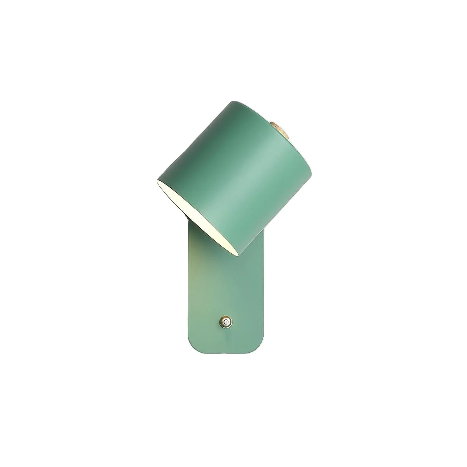 This plug-in wall lamp features a cylindrical light shade mounted on a rectangular backplate. The light shade is adjustable. The backplate features rounded corners. A cord extends downward from the backplate.