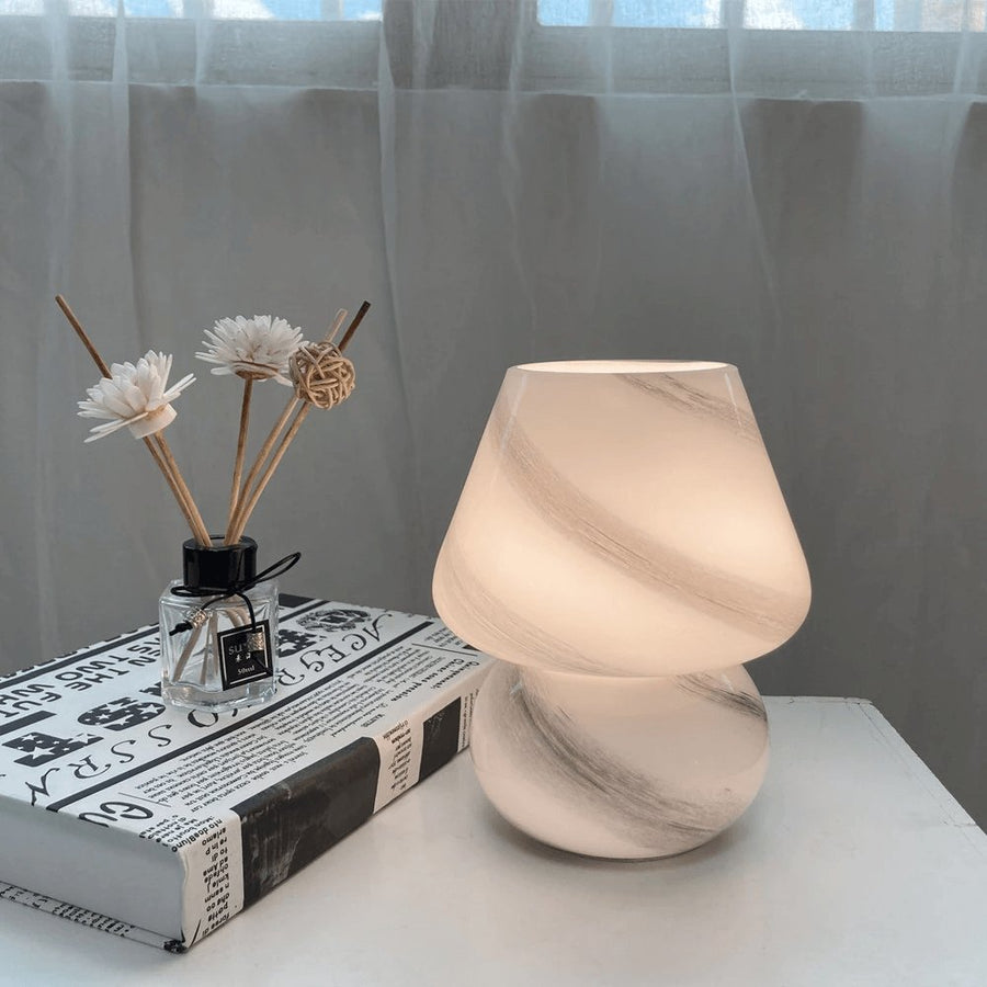 - Pattern: The lamp’s body features a streaked pattern. The pattern extends across both the bottom and top sections